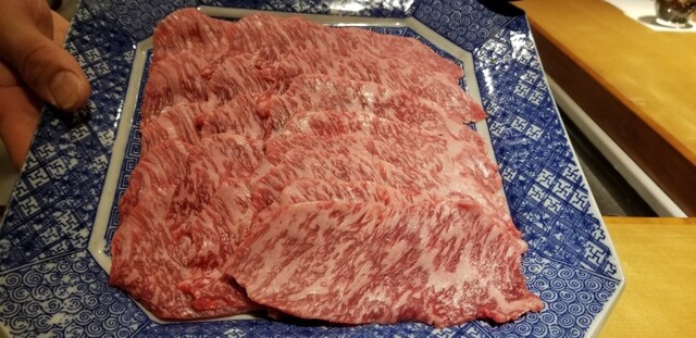 ⑯高森和牛サーロイン(山口県周南産、沼本カット)、原木椎茸(岡山県美作産、ムサシ農園)、真昆布&4種(いりこ、鰹節、鯖節、あご節)の節の出汁しゃぶ