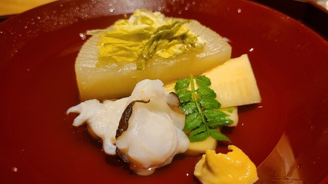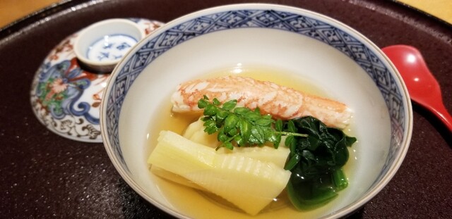 ④ホウボウ、松葉蟹真薯、雪下うるい、利尻昆布&鮪節の出汁のお椀 利尻昆布出汁は透明感がありながらも輪郭がはっきりしたキレのある味わい、それを邪魔しない血合いを取り除いた鮪節の濃い深みが良い