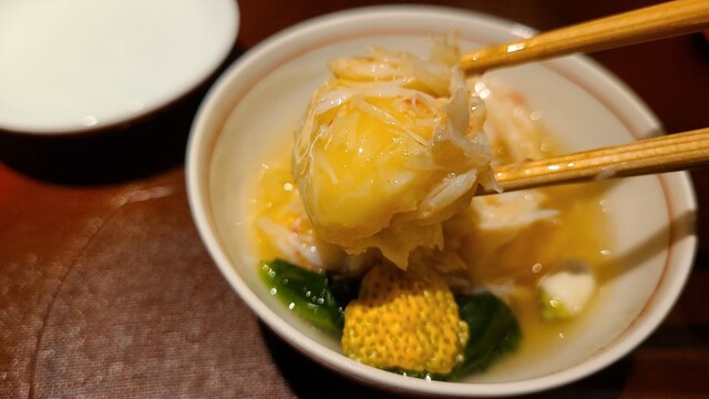 ②松葉蟹(鳥取県産)、松葉蟹の蟹味噌掛け、金魚草&胡瓜添え 茹で蟹のしっとりしつつも力強い旨みを味わい 蟹味噌のほろ苦さを含む甘みと旨みが味わいに奥行きをもたらしています。