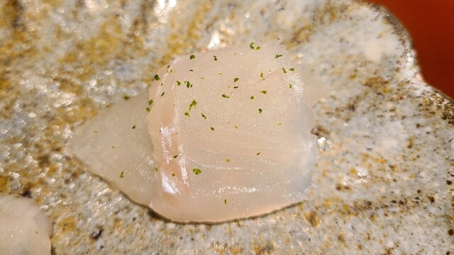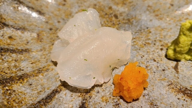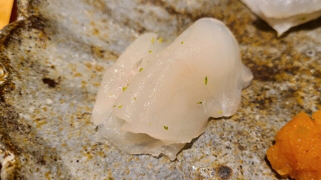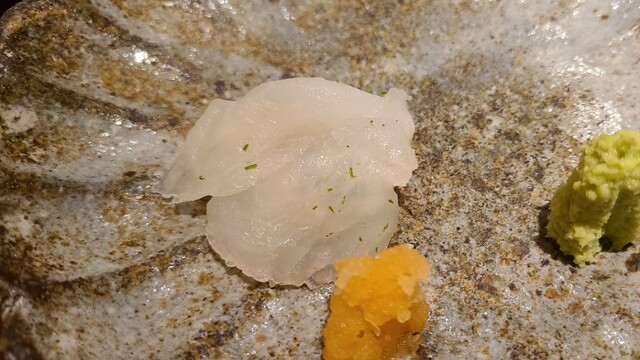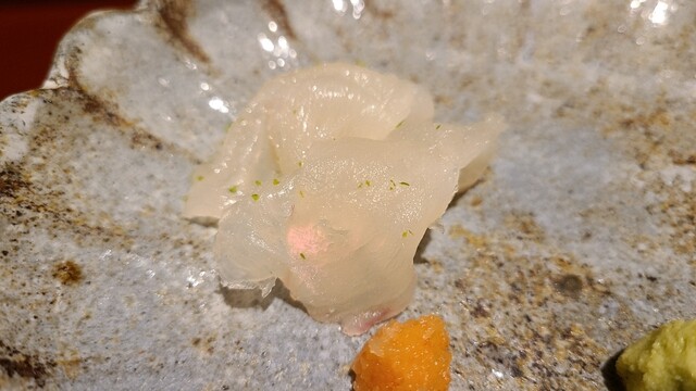 ⑫真鯵(愛媛県来島海峡産、2日寝かせ) 産卵期は春~夏、旬は秋~冬。 血抜きが完璧だと薬味など不要という事が良く分かります。 自然な旨みと甘みが魚自体の潜在力を感じさせます