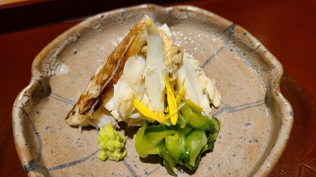 ③真名鰹(山口県上関産)の柚香焼き、花独活、葉牛蒡 産卵期は初夏~夏、旬は冬~初夏 独特の臭みを抑えて旨みを引き出すのが難しい 水分を微かに残し芳ばしさとシットリ感が同居 柚子の香りが爽やかです♪