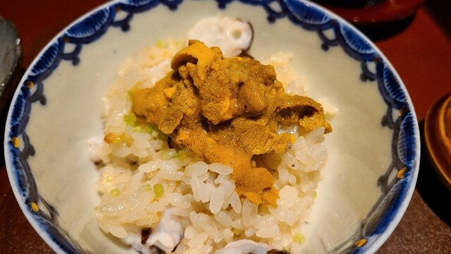 ⑲松葉蟹(鳥取県産)入りトリュフご飯の卵とじ丼、冬トリュフ&紫雲丹(長崎県平戸産)載せ 卵とじがコースの〆に組み込まれるとは! 極上の出汁を使った卵とじは裏メニューで2度頂きましたが、メチャうまです!