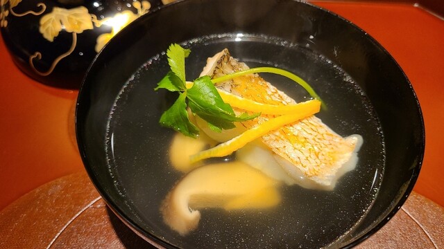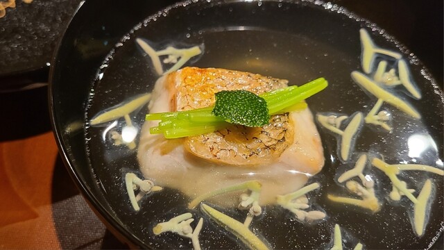 ⑤炭火焼き白甘鯛&三つ葉の茎載せ、丘若布添え、利尻昆布と血合抜き鮪節の出汁のお椀