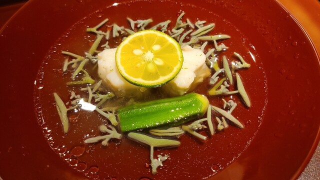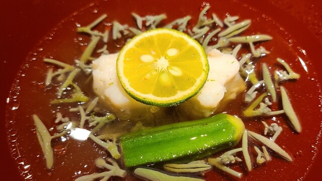 ④ホウボウ(山口県上関産)、松葉蟹真薯(鳥取県産)、雪下うるい(山形県産)、利尻昆布&鮪節の出汁のお椀 プルンとしたホウボウは甘みのある旨み、松葉蟹の旨みが凝縮した真薯は断トツの美味しさ。