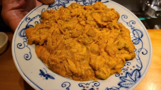⑬真鯛(愛媛県来島海峡産、3日寝かせ)、紫雲丹(長崎県平戸産)載せ 紫雲丹の産卵期は初夏~晩夏、旬は初夏~晩夏、穏やかな甘みが特徴 真鯛も紫雲丹の組合せは味わいが強いのでお造りの〆としてピッタリ
