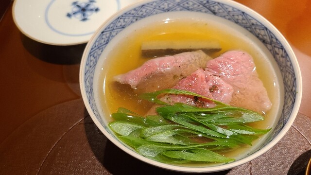 ⑰榊山牛のサッと煮、難波葱、真昆布&いりこ、鰹節、鯖節、あご節の出汁のお椀、 榊山牛(広島県熊野産)は肉の味が強い!ので出汁通しする位が好み お椀もの4杯目だが全て味わいが異なります
