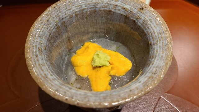 ③本ミル貝(愛媛県産)の海水ジュレ掛け、赤雲丹(愛媛県産)載せ