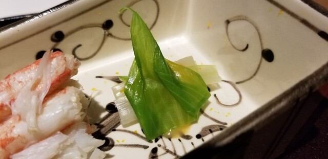 ②毛蟹の身&蟹味噌(北海道オホーツク海産)、本ミル貝(愛知県産)、金魚草、胡瓜、土佐酢で 若い毛蟹らしい甘み&旨み、蟹味噌のコクも良いですね。 本ミル貝はコキュコキュした美味しい味わい