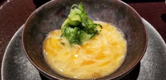③羅臼昆布出汁の冷製茶碗蒸し、鼈(静岡県浜名湖産)餡 産卵期は夏、旬は冬、養殖は浜名湖が有名。 鼈は獣臭を感じ易いのですが、こちらでは心配無用。 滋味深くコクがあり、食べ易く美味しい♪