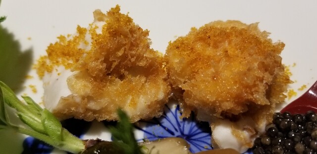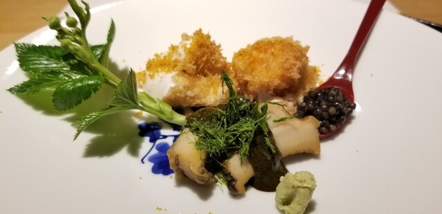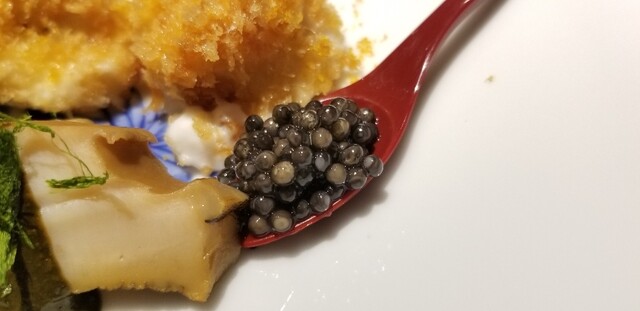 ①豆乳仕立ての雲丹プリン、フレッシュキャビア載せ
