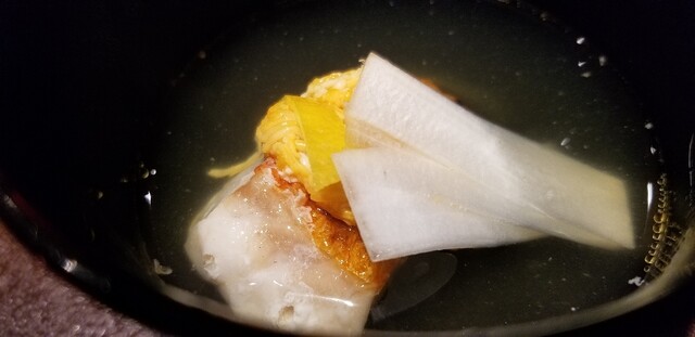 ⑭鮴(メバル)の揚げ浸し、白葱、青葱、ヨモギの生麩、真昆布&いりこ、鰹節、鯖節、あご節の出汁のお椀