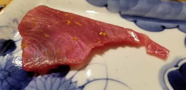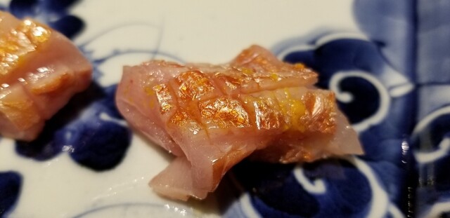 ⑩金目鯛(静岡県駿河湾産、サスエ前田魚店、10日熟成) 産卵期は夏、旬は秋~晩冬。 金目鯛は脂のりは落ちつつある時期なので、季節の移り変わりに応じて、包丁を細かく入れ、旨みを感じ易くしてあります。