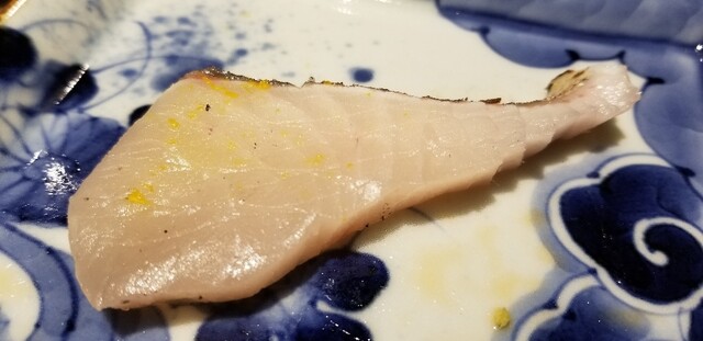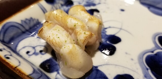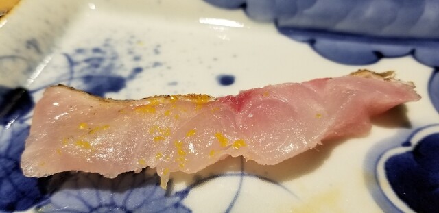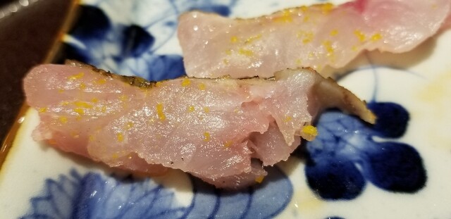 ⑥虎魚(愛媛県来島海峡産、2日寝かせ) 産卵期は初夏~夏、通年を通して美味しい。 削ぎ落とした魚本来の味わいを時間を掛けて旨みを引き出しています。 昆布〆ではない虎魚のみの旨みに凄みを感じます♪