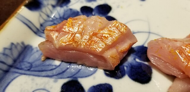 ⑩炙り金目鯛(静岡県駿河湾産、サスエ前田魚店・10日熟成) 産卵期は夏、旬は秋~晩冬。 金目鯛の脂のりは落ちつつある時期なので、季節の移り変わりに応じて、包丁を細かく入れ、旨みを感じ易くしてあります。