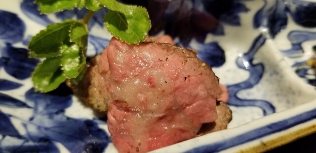 ⑮仙台牛(A5ランク12等級未経産)のイチボのローストビーフ、和辛子&山椒ソース 備長炭でじっくり焼き上げられ肉自体の旨みが増していますし芳ばしく薫り立っています 山椒ソースがピリッとしてアクセントに