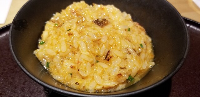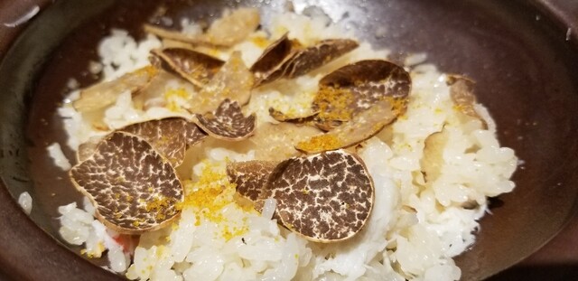⑰夏トリュフご飯(卵入り)、毛蟹入り、唐墨掛け 夏トリュフの艶やかな薫りが立ち昇って来ます。 口腔内が薫りで溢れ、満ち足りた気持ちになります。 旨塩な唐墨が味わいに深みを加えます。