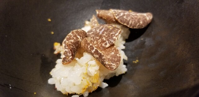 ⑰春トリュフ(イタリア産)ご飯(プレーン)にホタルイカのトッピング 春トリュフの控えめながらも艶やかな薫り、花粉症であっても堪能できるほど立ち昇って来ます。
