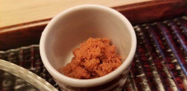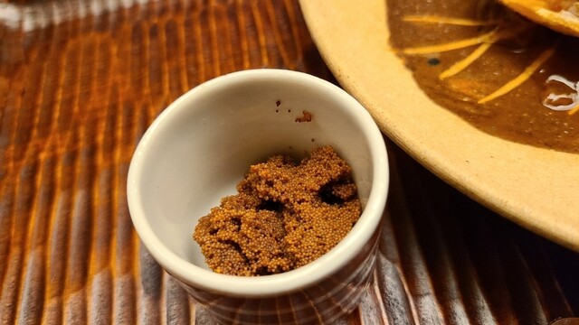 ①間人蟹(雌、ハーフ)(京都府間人産)の外子 外子は別分け、プチプチ感、軽めの旨み 原則、内子の方が味わいがしっかりしてます 舌の上に5秒ホールドして楽しみます