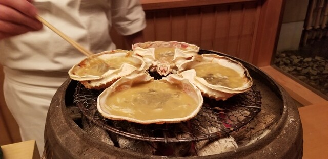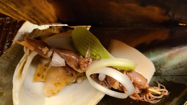 ④炙り石影貝(岩手県三陸産) 正式名称は蝦夷石影貝(石垣貝とも言われる) 産卵期は冬~春、旬は夏~秋 炭火で炙られて旨みが活性化し、海の豊潤さを感じさせる味わいに。