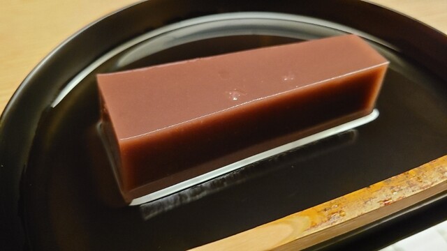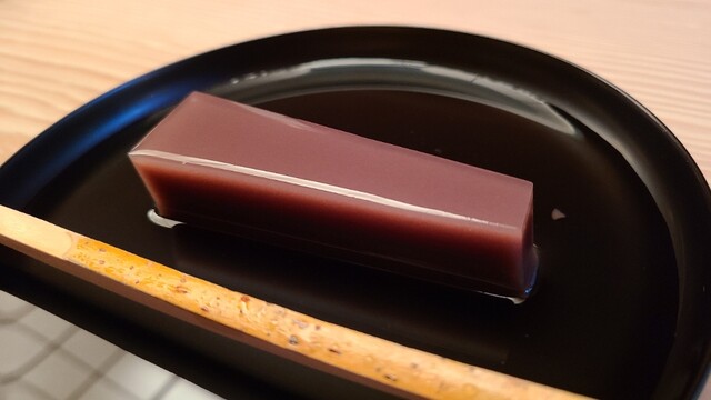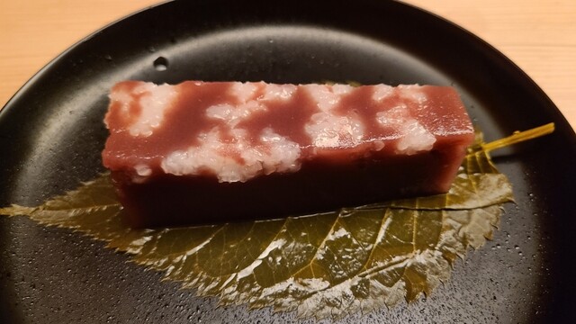 ⑮夜桜(もち米入り自家製小豆羊羮) もち米を桜、小豆の羊羮を夜の闇に見立てた春らしいオリジナル羊羮です。 羊羮は優しい甘みに仕上げられており、お料理の〆に相応しいデザートでした。