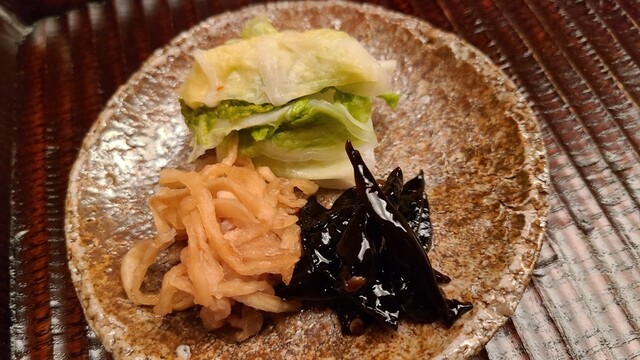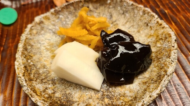 ⑮お漬け物(切干すぐき、木耳佃煮、大根) 塩は控えめで食べ易いです。 お漬け物まできっちり一級品です♪
