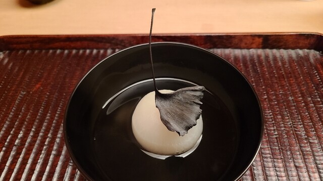 ②栗(長野県小布施産)の渋皮煮揚げ、銀杏(三重県伊賀上野)の摺り流しを裏漉したお椀 栗の渋皮煮揚げが甘みが際立っていたのと揚げることで芳ばしさを纏い抜群に良かった