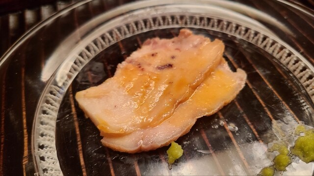 ③金目鯛(千葉県銚子産)、紫雲丹(熊本県天草産) 産卵期は夏、旬は秋~晩冬。 旬は過ぎたものの上品で濃い旨みを楽しめたので、紫雲丹を合わせる必要なかったのでは? 少し味わいが主張し合った様に感じました