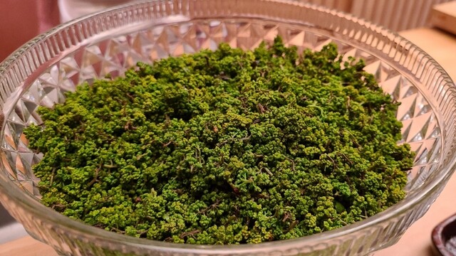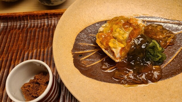 ①間人蟹(雌、ハーフ)(京都府間人産)、内子、土佐酢ジュレ、青もずく 身の穏やかな甘み、蟹味噌のコクと微かな苦み、内子のしっかりした旨みと甘み、それらが渾然一体とした濃い蟹の旨みが強い印象を残します