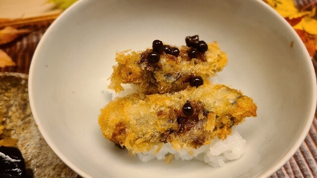 ①素揚げ黒鮑(京都府間人産)粥 素揚げされ芳ばしい黒鮑、適度に弾力のある仕上がりで噛む程に滋味と旨みが拡がります 粥とは言うものの煮えばなの様に芯を残した炊き上がりで黒鮑とのバランスも良いですね