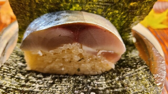 ⑬真鯖寿司の磯辺巻き 産卵は春~夏、旬は秋~冬 腹の側線付近に模様が無いので真鯖と判断 生臭みはゼロで、肉厚で弾力あり、脂のりも良く、旨みと甘みが素晴らしい