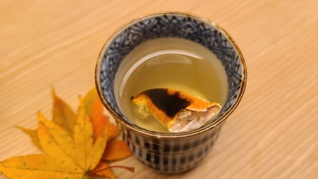 ②栗(長野県小布施産)の渋皮煮揚げ、裏漉し銀杏(三重県伊賀上野)の摺り流しのお椀 恐らく利尻昆布と鮪節のお出汁に裏漉した銀杏を摺り流してあります 銀杏のエグみゼロ、仄かに青い旨みが沁々と滲みる
