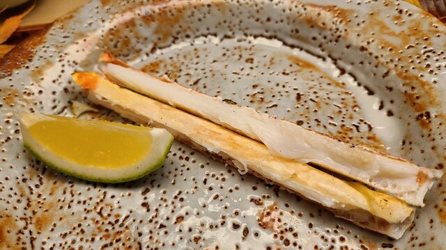 ⑦炭火焼き間人蟹(2番脚)、青檸檬添え