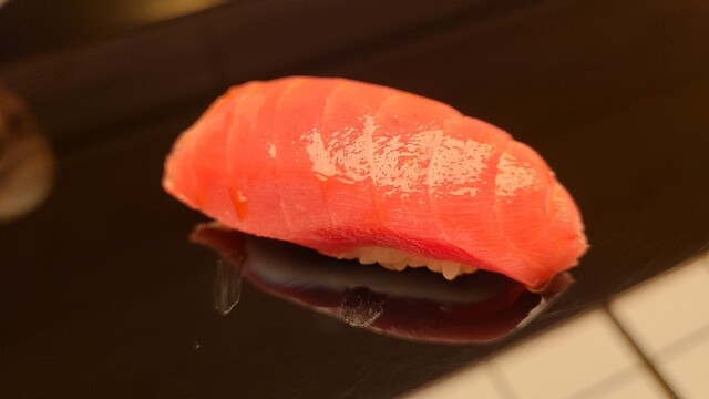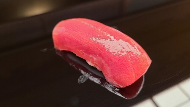 煮切り醤油をサッと塗るが赤身自体はヅケでないため、赤身の風味とコクがダイレクトに。