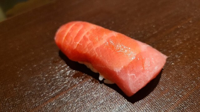 ⑮近海本鮪大トロ(千葉県勝浦産、137kg) 脂がのった大トロ、滑らかな脂が溶け出す 赤身→中トロ→大トロと徐々に同系統の味わいが濃く強くなっていますが旨みを求めて過ぎたる脂を求めないのが素晴らしい