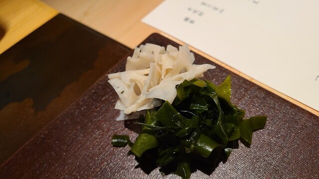 ガリ、若布(千葉県鴨川産)、薄切り酢蓮根(千葉県鴨川産)、自家製ポン酢 肴が始まる前にビールと共に少しずつ オーケストラの演奏が始まる前の楽器の音出しの様にしっそりと秘めやかに!しみじみと美味しい