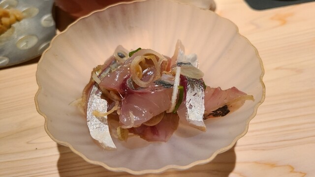 ⑲真鯵(千葉県金谷産、11時水揚げ) 身が脂で淡いピンクに、肉厚で脂のりが凄まじい! だけでなく、滋味も深く濃く、悶絶もの でも後味はスッキリとしており絶妙のバランス
