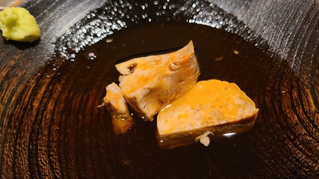 ⑤煮鮟肝(千葉県銚子産、朝水揚げ) 産卵は春~初夏、旬は通年、特に晩冬 湯気が立つ煮立ての鮟肝を目前で切り分け 形を保っているものの、口腔内でスッと溶ける コクのある旨みと円やかな甘みに染々と唸る