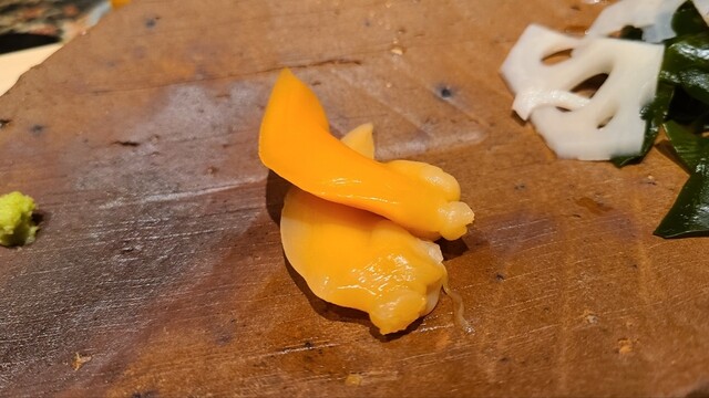 ⑳塩水蝦夷馬糞雲丹(北海道浜中産) 産卵は夏~秋、旬は初夏~夏 舌の上に5秒ホールドして味わう 濃厚な甘みとコク、同じ浜中産でも養殖は只管甘いのですが、天然らしく後味に複雑な余韻が顔を出します