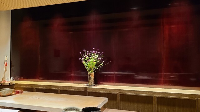 白木カウンター6席、板場の背面は漆塗りの板がズラリと並びます 千葉のお店から持ち込まれており、既視感が強いですね 東京でも引き続き、コンパクトで上質な空間の中でゆったりと寛いて楽しむことが出来ます