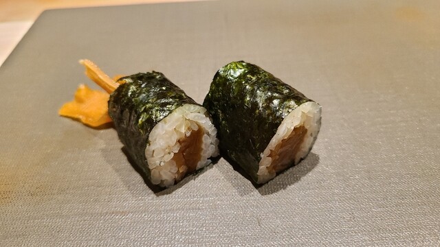 ⑨炭火炙り真鰯(千葉県銚子産)棒寿司の磯辺巻き 産卵は冬~初夏、旬は通年 身は軟らかく脂が加熱され活性化、旨みが増しています 提供の流れと味わいの濃淡の変化、五感が刺激され至福なひととき