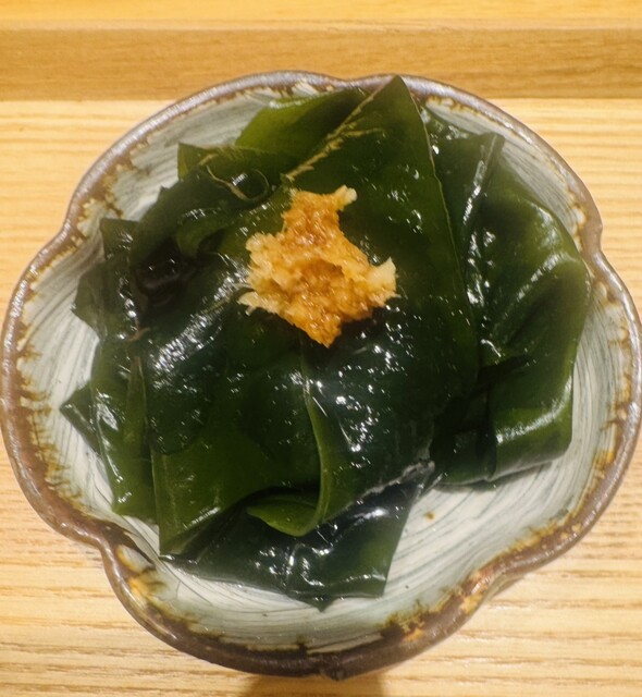 まずは笹一を冷やで。冷や=常温で飲む笹一のひやおろし。まろやかな口当たりで甘味もあって優しく身体を包みこむかのような感覚。ワカメちゃんも美味しく食べすすめます。