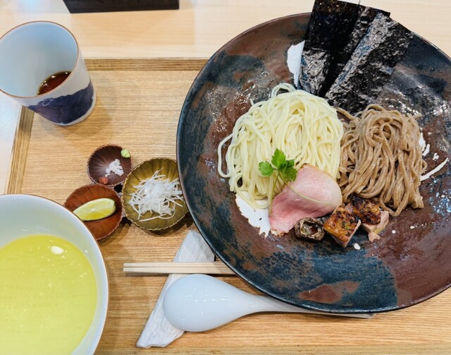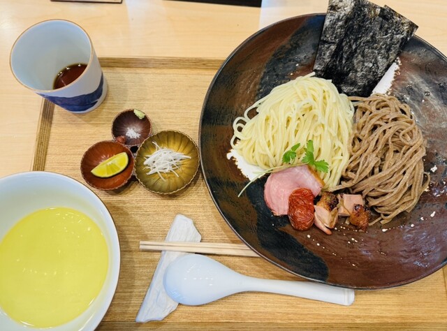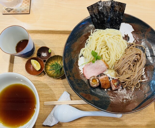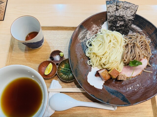 わんたん入りしおチャーシュー麺(麺少なめ) + つけ麺(しょうゆ味・麺少なめ) + お出汁割り(かつお)