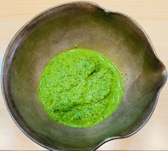 塩をかけての素手喰いは最早常連客としてのマストなスタイルか?黒い麺の力強さにフォーカスして堪能していると、Tさんから緑色のモノが…