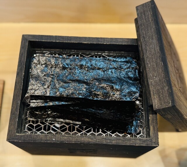 そしてつけ麺へ…。これからの時代は手で麺を食べるのが楽しみ方の一つになるのかな。まずは推奨されている手掴みで麺だけを啜ります。小麦の感じ方や食感などに「柔らかさ」が加わった気がします。今日は海苔3枚に黒い麺を乗せて安曇野山葵を乗っけて食べようとしているのに気づいた飯田さんがカウター越しに醤油を垂らしてくれたのでとてもプレミアムな食べ方も体験。久々にブラウンマッシュルームが麺皿に。何回も食べているつけ麺も色々な楽しみ方や変化があるので喜びの探し方はinfinityです。