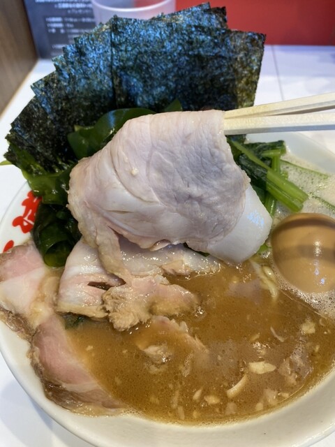 評判を聞いてはるばる金町までやってきました。11時15分頃に到着しましたが、すでに40人程の行列ができていました。1時間15分ほど待って着席。まずは、ライスが提供され、それから5分ほどして特上ラーメン(すべて普通で)が着丼。吉村家に比べ醤油の返しは控えめで、豚骨とのバランスは絶妙です。大き目のチャーシューとのりがたっぷりオンされています。トッピングのワカメもお勧めです。大変美味しく頂きました。