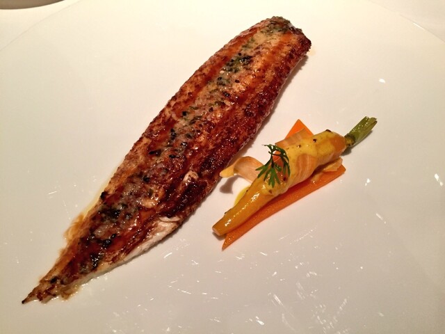 フランス産舌平目のファルシをシャルドネのソースで人参のコンディマンテ