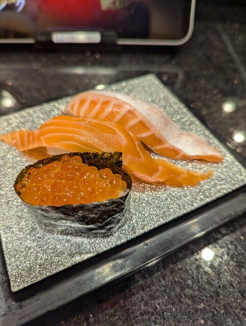 上から大トロサーモン、サーモン、イクラ軍艦