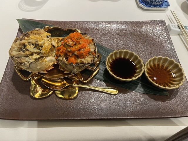 蒸し上海蟹(雄・雌):2種の酢でいただきました。雄は白子がねっとり、雌は旨みのある卵がたっぷり。身をかき出して甲羅に詰めてくださっているので食べやすいです。小さい殻が結構残ってたけど。