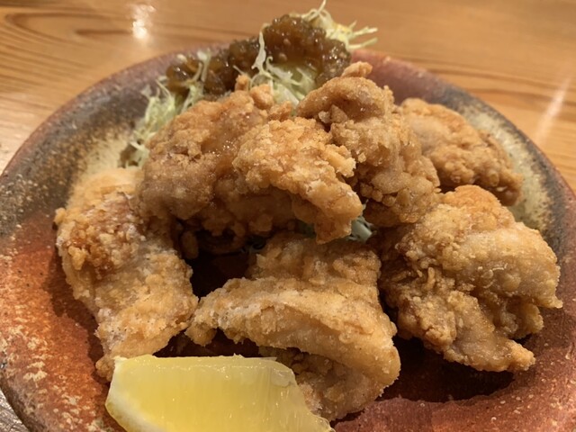 唐揚げはオーダーしてから目の前でカットし、塩味をつける。これも大きめ。