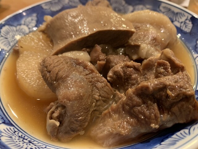 牛スジ煮込みは、大根も牛すじも一切れがものすごく大きいのに、甘めのスープがよく染み込んでいて美味しい。出された時大きさにびっくりしたが、これはアリ。今度うちでもやってみよう。